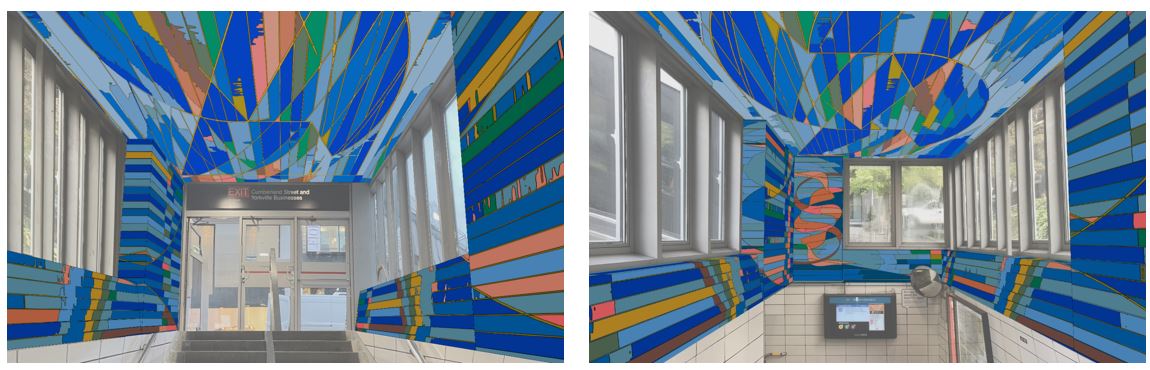 Confluence is a site-specific translation of one of Granados’s abstract digital drawings. The proposed mosaic work spans the walls and ceiling. Inspired by the artist’s experience as a refugee coming to Canada from Guatemala and his move to Toronto in 2010 to attend graduate school, the artwork draws on themes of inclusion and the making of home in Toronto. This artwork proposes a richly coloured design that brightens the Cumberland entrance, hoping to strike a sense of harmony between the feeling of energy in movement that characterizes Toronto and the sense of peace needed to coexist among so many others. The colours in the composition allude to and honour the history of our city as a meeting place.