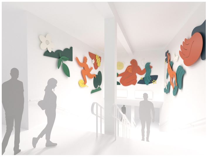 Earth Runs Wild is an homage to the existing flora and fauna surrounding Castle Frank Station. Mother Earth sits centre, overlooking Earth and Water to her left and right, emphasizing the delicate balance that sustains life on Earth. It serves as a reminder of a sense of community responsibility and stewardship in preserving and nurturing our beautiful planet. As a three-dimensional wall art installation, (spanning 3 connecting walls) the laser cut, powder coated aluminum pieces stand off the walls, creating a 3D low relief effect that brings a touch of the natural world into the station’s walls, reminding commuters of their bond to the earth amidst their bustling routines.