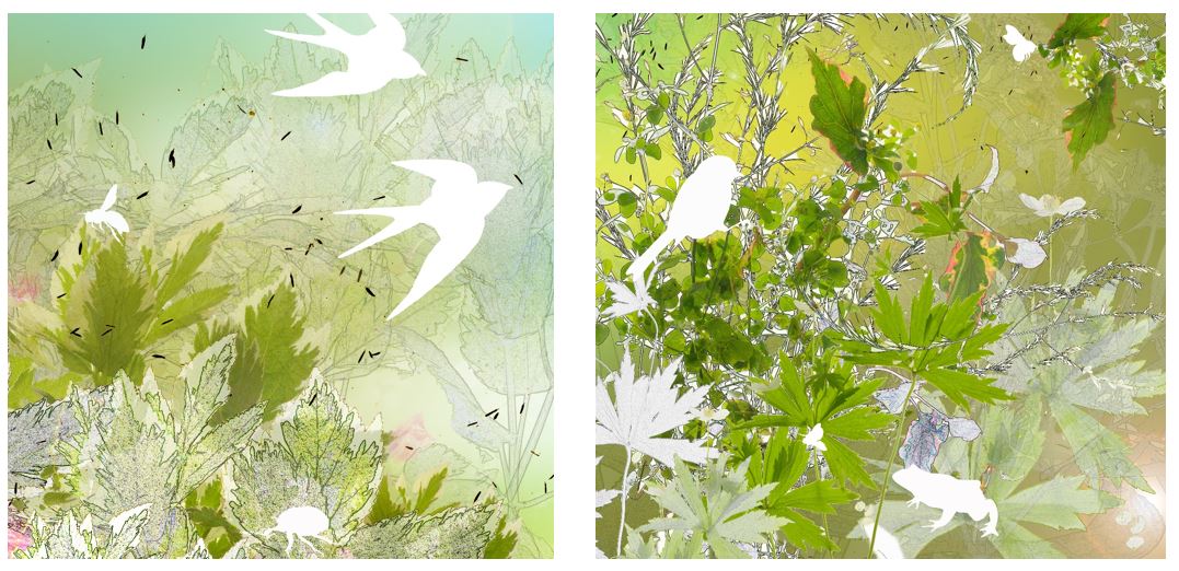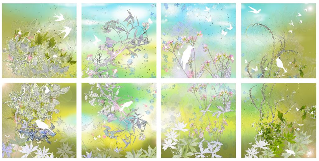 Field is a photographic painting on glass comprised of flora, meadow flowers, indigenous plants, birds, and insects. Field both references the history of the neighbourhood and the development of Withrow Park as an environmental site. The work hopes to evoke a contemplative space, an oasis within the functional space of the subway. The components of Field are arranged in a way that is intended to provide the viewer or passerby with a sense of lying in a field looking up. Plants and flowers reach into the composition from all sides, layered with fallen petals and seeds of renewal. Seasonal change is implied as winter, spring, summer, and fall are represented by the life cycles of the flora.