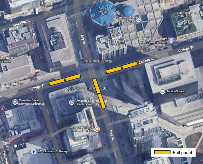 During the first week of construction, TTC plans to deliver new streetcar rails on flatbed trailers and store them at or near the work zone on College Street and Bay Street. Temporary lane and parking restrictions may be required. Final storage locations may be adjusted after coordination with the Contractor. As new rail installation progresses, the flatbed trailers will be removed from site.