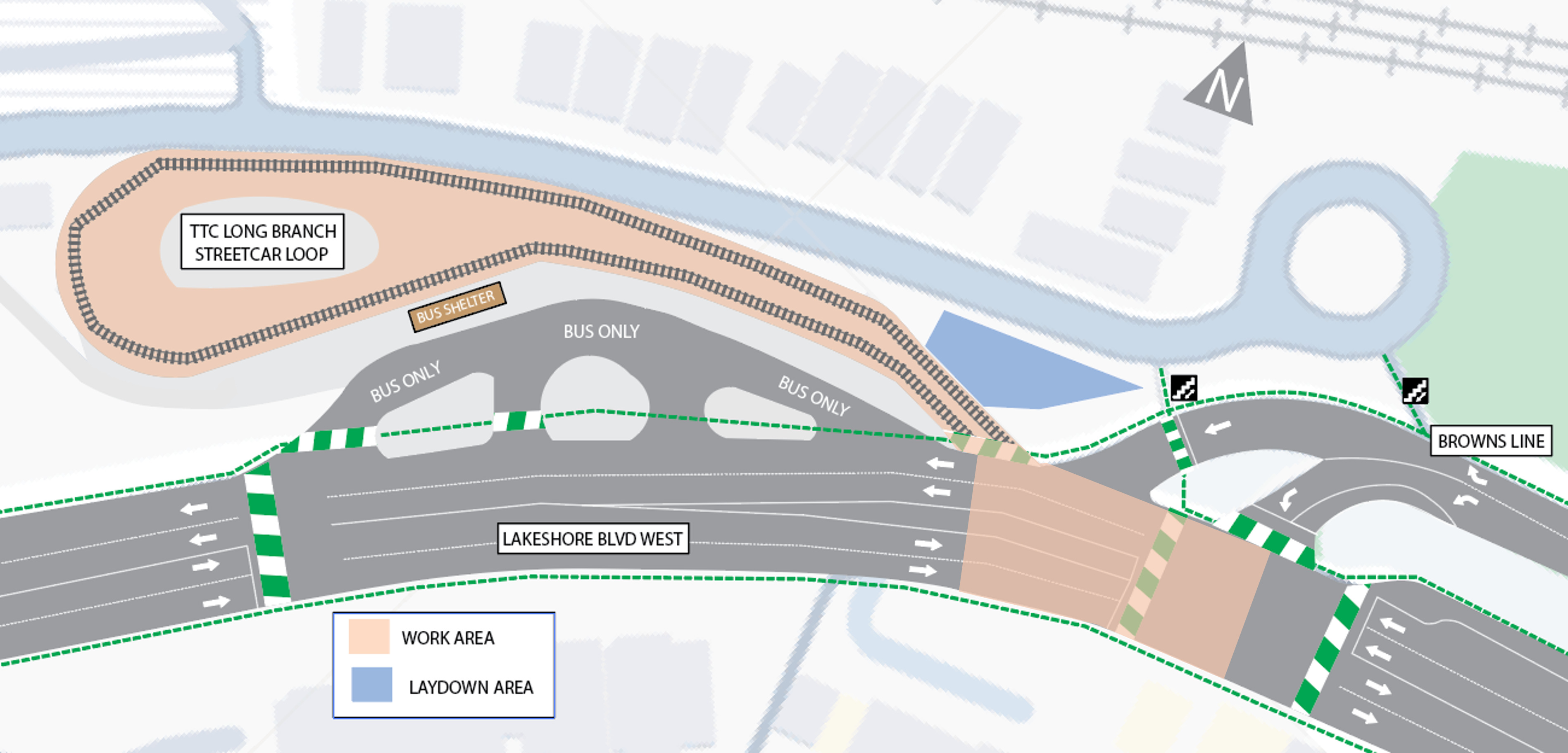 During construction, Long Branch Streetcar Loop will be closed, and buses will replace streetcars to Humber Loop. The Long Branch Bus Loop will remain open during construction.