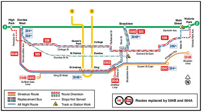 During this work, service on the 504/304 King, 505 Dundas, 506/306 Carlton and 514 Cherry routes will be impacted.