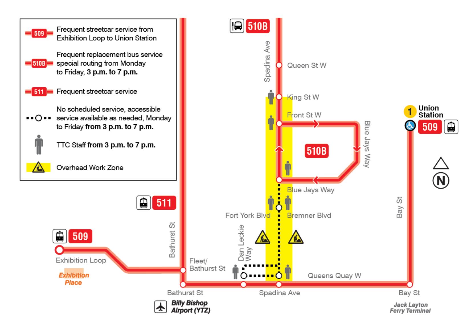 From 3 p.m. to 7 p.m., Monday to Friday only, 510 Spadina buses will no longer operate on Spadina Avenue between Front Street W. and Queen’s Quay W. During these hours, buses will instead turn left on Front St. and then right on Blue Jays Way, looping around back to Spadina Ave. to go north to Spadina Station. There will be no 510 service during these hours at stops on Spadina Ave. at Fort York Blvd./Bremner Blvd. and at Queen’s Quay W.