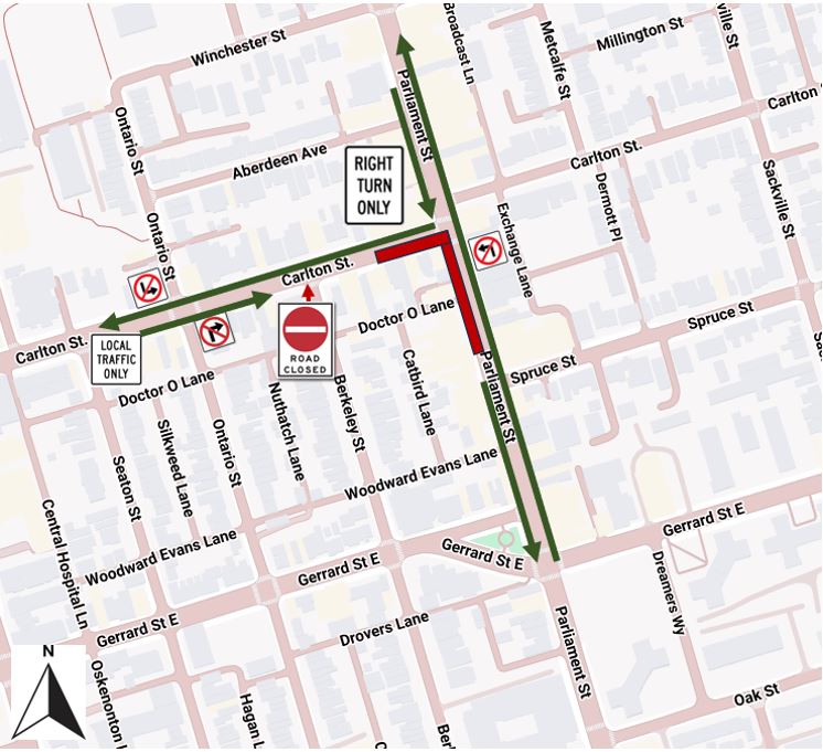 - Carlton Street will be closed to eastbound traffic east of Berkeley Street.