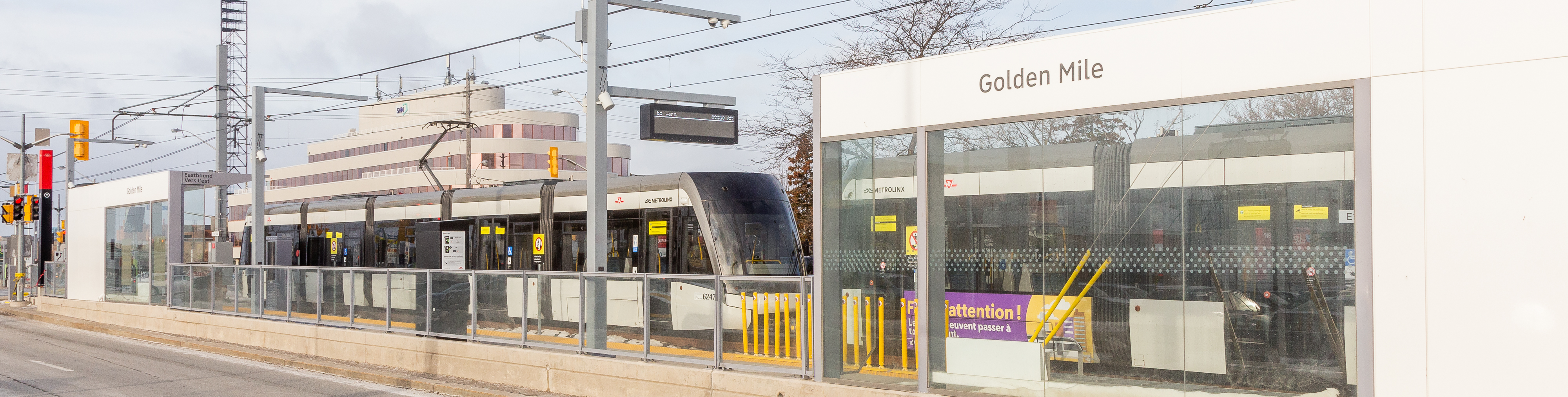 - Sloping walkway to Eglinton Avenue crosswalk, located at the east end of the LRT Platform, beyond the last car of the train.