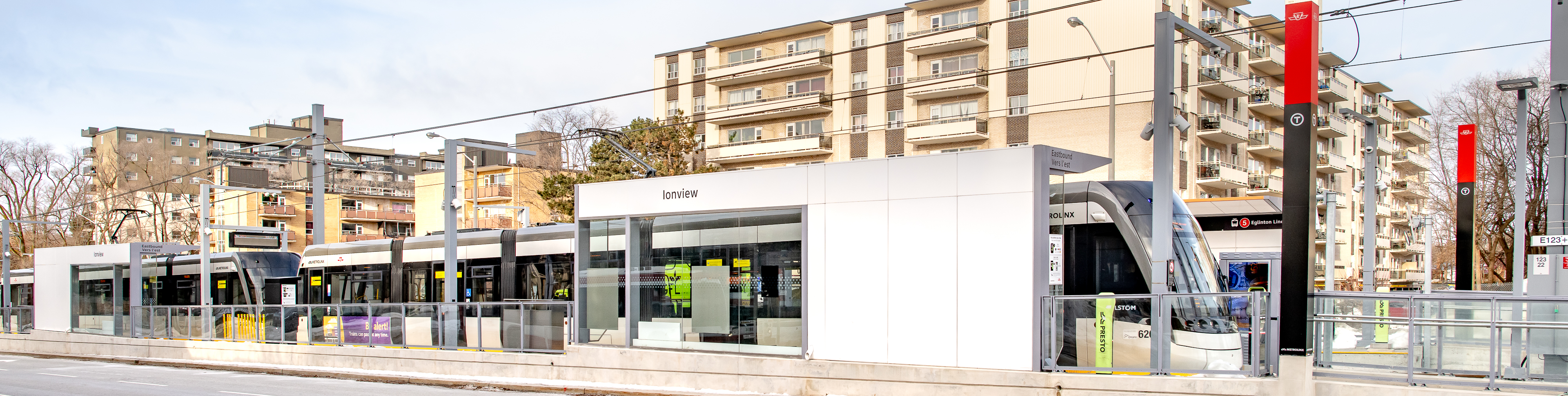 - Sloping walkway to Eglinton Avenue crosswalk, located at the east end of the LRT Platform, beyond the last car of the train.