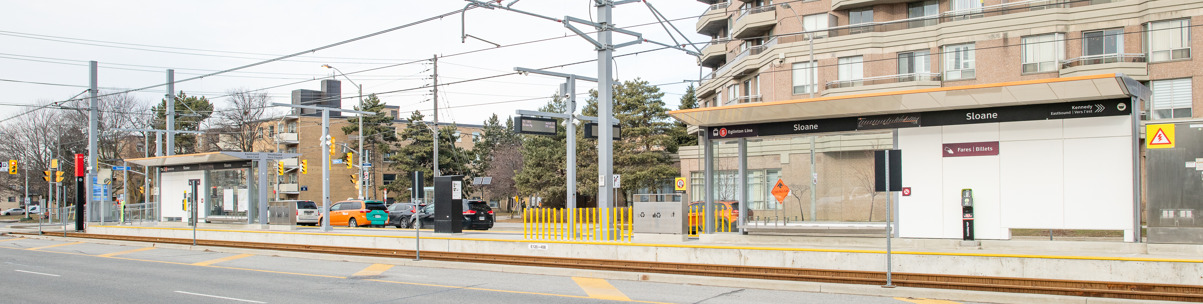 - Westbound towards Mount Dennis, east side of Sloane.