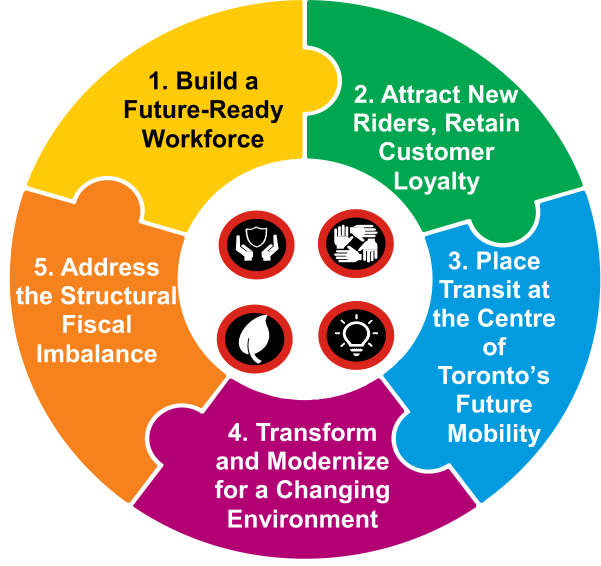 Together the following five strategic directions, underpinned by key principles, set the TTC on a path to be successful in moving Toronto, connecting communities, and achieving the benefits of public transit investment.